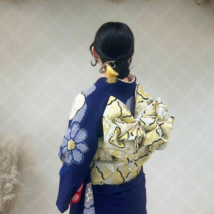- ・帯の位置はウエストより高めに結び、体型を美しく見せる効果があります。また、帯には多くの装飾が施されており、着物全体の美しさを引き立てます。帯の種類や結び方は、女性の着物姿を美しく見せるための重要な要素であり、日本の伝統的な美意識が反映されています。